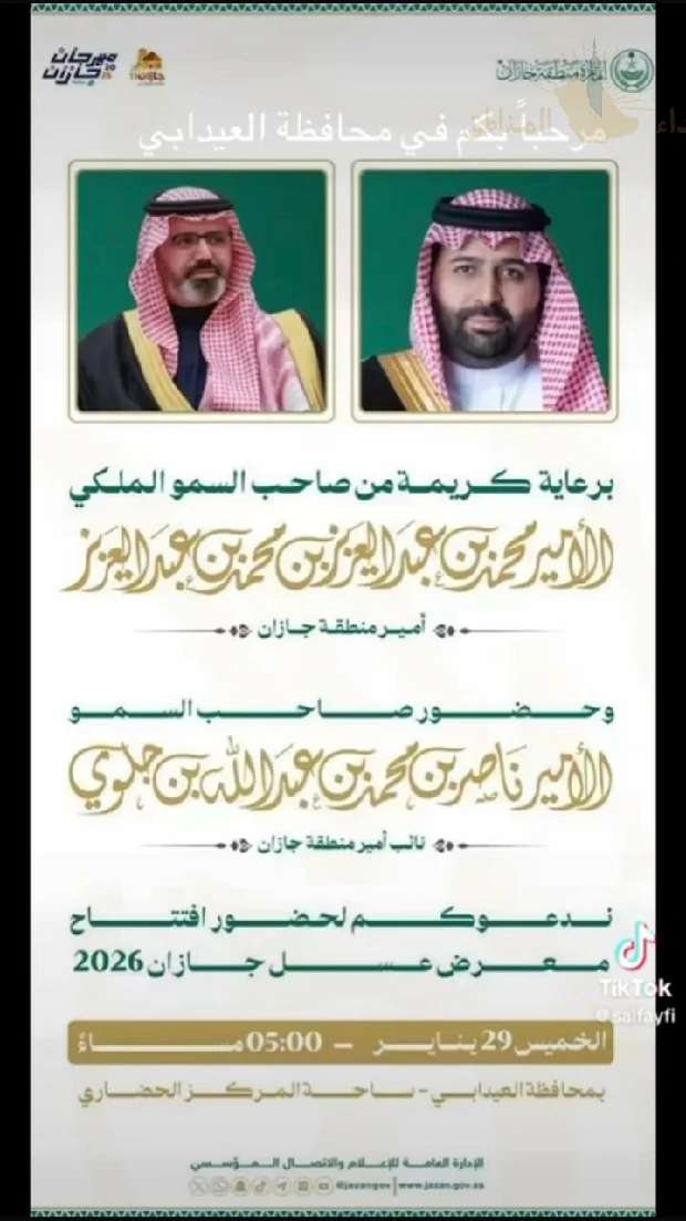 تحت رعاية كريمة من صاحب السمو الملكي الأمير محمد بن عبدالعزيز أمير منطقة جازان، وبحضور صاحب السمو الأمير ناصر بن محمد بن عبدالله بن جلوي نائب أمير المنطقة، تستعد محافظة العيدابي لاستقبال زوار معرض عسل جازان 2026، وذلك ضمن فعاليات مهرجان جازان 2026، في حدث يعكس الحراك التنموي والثقافي الذي تشهده المنطقة.