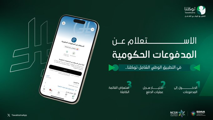 أعلن تطبيق توكلنا، التابع للهيئة السعودية للبيانات والذكاء الاصطناعي (سدايا)، عن إتاحة خدمة الاستعلام عن المدفوعات الحكومية لجميع المستفيدين، بما يتيح لهم متابعة سجلات الدفع واستعراض القائمة الكاملة للمدفوعات المنفذة بسهولة وفي مكان واحد.